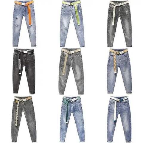 กางเกงวิ่งจ๊อกกิ้งแบบคลาสสิกของผู้ชายกางเกงยีนส์บางลำลองปักรูขาดสำหรับผู้ใหญ่